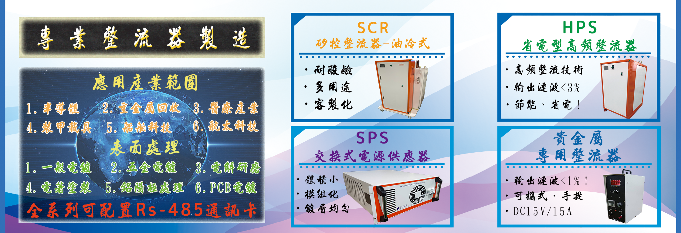 專(zhuān)業(yè)整流機(jī)製造 電鍍/電解 /陽(yáng)極/PCB/鍍金/鍍銀 臺(tái)灣整流機(jī)最大規(guī)模製造廠(chǎng) 整流器の専門(mén)メーカー 整流器專(zhuān)業(yè)製造廠(chǎng) 矽控整流器(Silicon Controlled Rectifier) IGBT Controlled Rectifier 表面處理種類(lèi)整流器 Power supply 熱浸鍍鋅整流器 hot dip galvanizing Power supply ABS塑膠電鍍整流器 Abs plastic electroplating Power supply 電鍍整流器 Electroplating power supply 掛鍍整流器 Rack Plating Power supply 滾鍍整流器 Barrel Plating Power supply 電鍍整流器 Electroplating Power supply 電解整流器 Electrolysis, Electric Analysis Power supply 陽(yáng)極處理整流器 Positive Electrode Power supply 鋁陽(yáng)極氧化處理整流器 Anodizing Aluminium Process Power supply 電著塗裝整流器 Electrophoretic Deposition Power supply 貴金屬回收整流器 precious metal recycling power supply 水平電鍍 Horizontal PCB電鍍 Printed circuit board 矽控整流器(Silicon Controlled Rectifier) 油水冷式 Oil water Cooling 風(fēng)冷式 Air cooling 風(fēng)水冷式 Air water Cooling